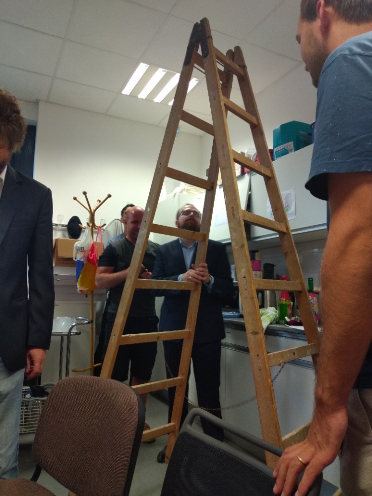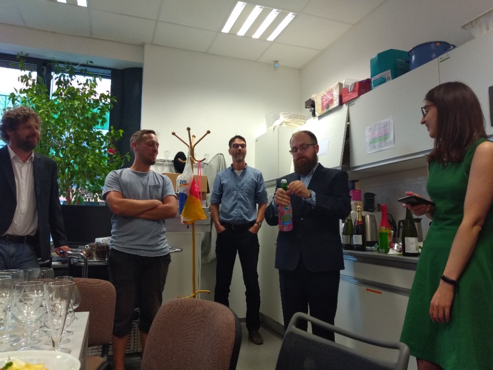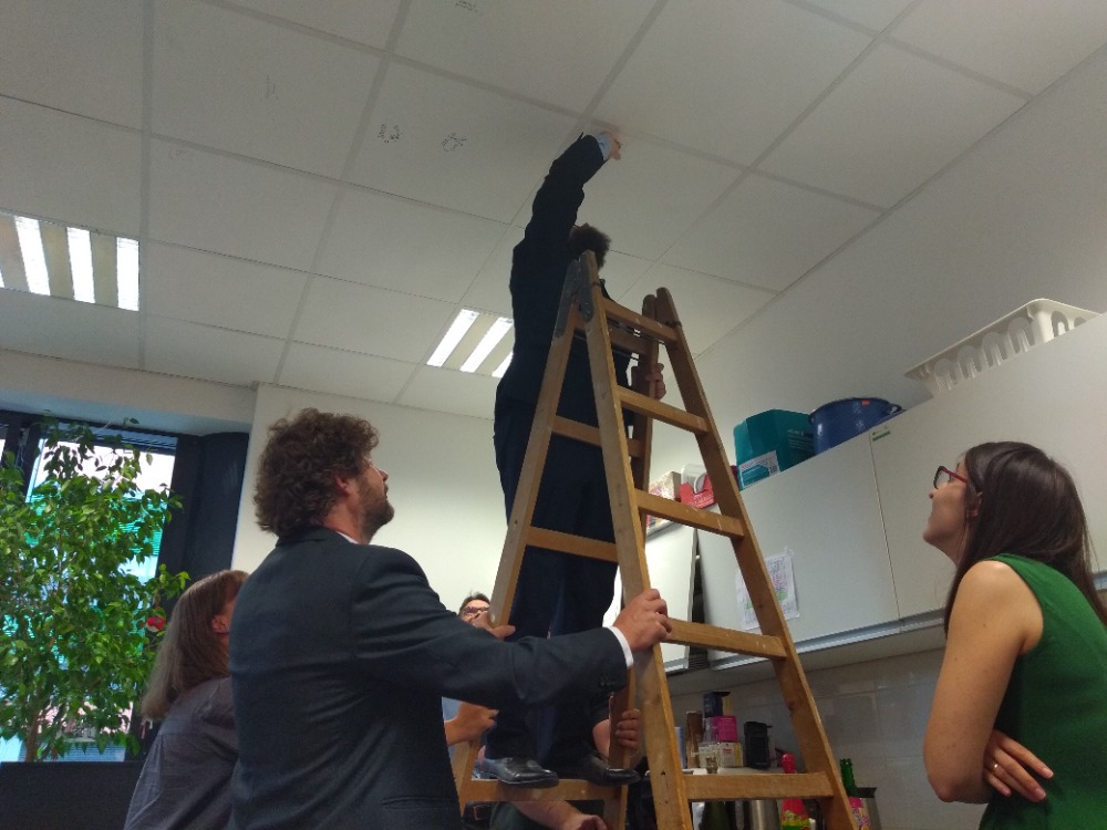 After the defense, he went through a traditional ceremony – marking the ceiling in the lab kitchen with the champagne plug and adding his name and date to the mark on the ceiling to make his achievement remembered forever!